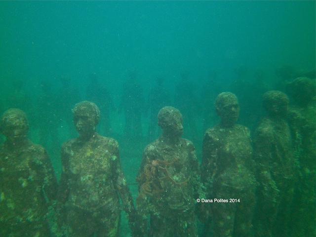 After breakfast the next day we headed off to the Aqua Center to board the boat for our second day of diving with a compliment of brand new divers ready to try their fins under the watchful eye of their instructor. We passed on the Bianca C, a 600 ft. cruise ship, sunk in 1961. A fire in the boiler room occurred just as she was anchoring in St. George’s Harbour. This is for advanced divers as the deck is at about 130 ft. where you can swim into the ship’s swimming pool and then continue to the bow. Our group chose Purple Rain for it’s abundant marine life and opportunities for photography. It has an enormous amount of bottom life: yellow, purple and orange sponges, coral whips and deep water. The M/V Veronica was our second dive site. It lies in 50 feet of water and is a beautiful artificial reef and home to frogfish in the summer. The third dive was back to the Underwater Sculpture Garden. The visibility had improved so we were able to find and photograph statues such as a man on a bicycle, a man at a desk with a typewriter and a standing Christ figure.